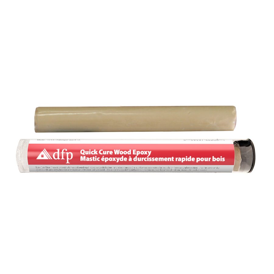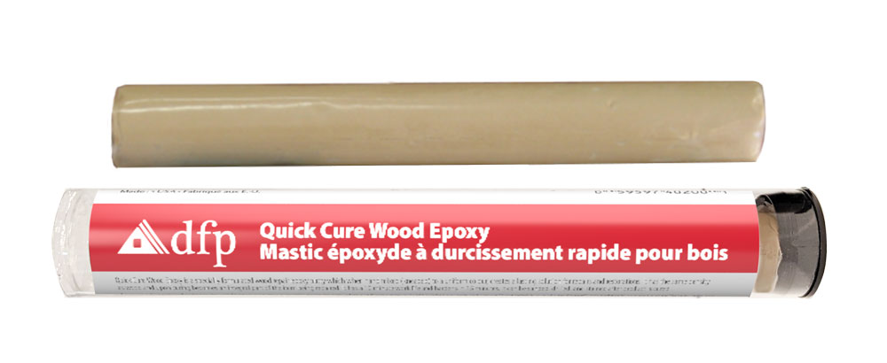 Quick Cure Wood Epoxy is a two-part epoxy system. Simply cut off the amount required and knead until uniform color is achieved and mixture begins to heat up. Apply to damaged area then level and contour the surface of the repair. Can be drilled, sawed, carved, sanded, stained or painted.